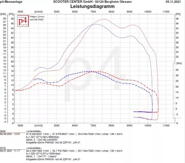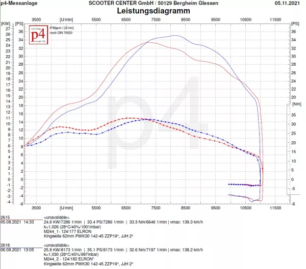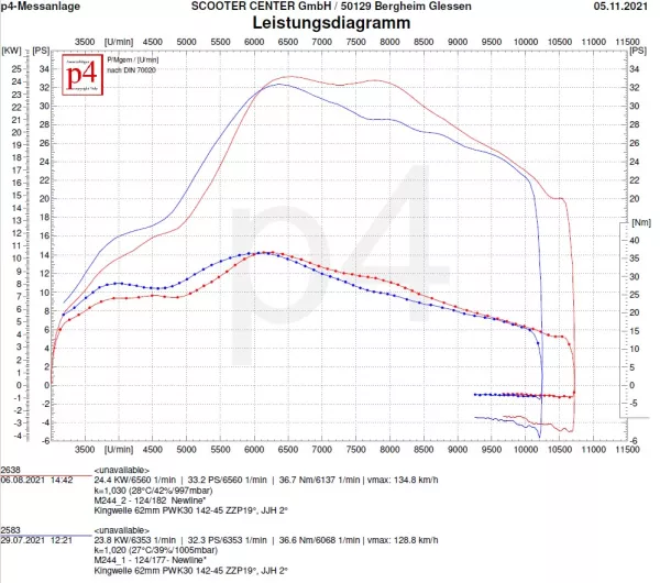 Der Newline zeigt generell im Leistungsanstieg einen anderen Charakter bei kleinen Steuerwinkeln als der Elron oder die Polini Box. Ähnlich zum Elron ist das eher unbeeindruckte Verhalten auf den geänderten Auslasssteuerwinkel. Die Spitzenleistung nimmt um fast ein PS zu, das maximale Drehmoment bleibt nahezu identisch und das Drehzahlband wird wie beim Elron etwas schmäler durch den späteren Resonanzbeginn. Auch in der zweiten Ausbaustufe behält der Newline die Spitzenposition beim Thema Drehmoment mit 36,7 Nm bei 6.137 U/min.