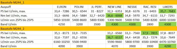 Der kernige Rennauspuff vom Bodensee hat schon auf der gesteckten Variante des M244 gezeigt das er auch ein guter Allrounder ist. Typisch wie bei allen anderen getesteten Resonanzanlagen, verschiebt sich auch das Drehzahlband in Richtung höhere Drehzahl, allerdings ohne das die Bandbreite darunter leiden würde. Mit einem Band von annähernd 4.300 U/min stellt er in dieser Ausbaustufe die größte Bandbreite zur Verfügung. Mit 37,8 PS in der Spitze muss sich der Lakers, zumindest in dieser Ausbaustufe, der Resi mit 37,9 PS geschlagen geben – aber wir arbeiten uns beim Thema Steuerwinkel auch gerade erst warm.