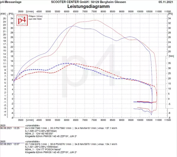 Die Nessie auch eher wie der Newline für gemäßigte Steuerwinkel gedacht, zeigt ebenfalls die deutliche Verschiebung beim Resonanzbeginn. Absolut betrachtet legt die Nessie „nur“ 2,5 PS in der Spitze drauf, allerdings lässt sich im Bereich zwischen 6.300 U/min und 9.000 U/min deutlich ablesen, dass der größere Auslasswinkel über diesen Bereich die Leistung deutlich anhebt.