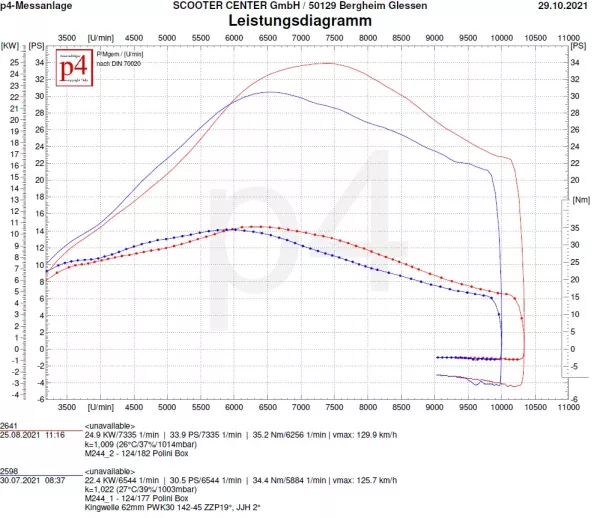 Die Polini Box reagiert sehr eindeutig auf die kleine Änderung am Auslass und legt ordentlich Leistung nach. Über 3PS und nicht ganz 1 Nm legt die Box dazu. Das Drehzahlband wird sogar um 700 U/min breiter, wobei der Graph sogar erst 100 U/min später die 25 PS Marke bei 5.500 U/min durchläuft und die Leistung bis 9.400 U/min deutlich länger hält. Die Steuerwinkel von 124° zu 182° scheinen der Polini Box eindeutig angenehm zu sein.