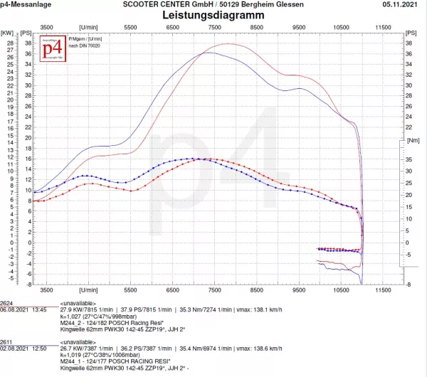 Die Racing Resi mit ihrem imposanten, dickbauchigen Erscheinungsbild vermittelt bereits den Eindruck von Leistung und der Gier nach Steuerwinkeln. Daher reicht der leicht erhöhte Auslasswinkel noch nicht zur absoluten Spitzenleistung. Der Beginn der Resonanz liegt auch hier deutlich später. In der Spitze liegt die Resi um 1,7 PS zu und das kann den leicht erhöhten Auslasssteuerwinkel zwischen 7.300 U/min und 10.000 U/min zur Leistungs- und Drehmomentsteigerung nutzen.