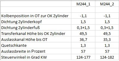 größere Steuerwinkel. Im Verlauf der Testreihe wird sich der Charakter der Leistungskurve der ein oder anderen Auspuffanlage noch verändern. Deshalb befreien wir den M244 im Auslasskanal von etwas Material und stellen die Auslassoberkante auf 182° ein. Die Auslassbreite bleibt hierbei unberührt und bleibt bei einem Sehnenmaß von rund 57 %. Als Spacer verwenden wir am Zylinderkopf sowie am Zylinderfuß 1.5 mm plus eine 0.3 mm Dichtung am Zylinderfuß. Damit bleiben die Steuerwinkel hier bei 124°: