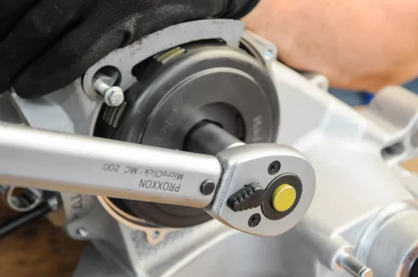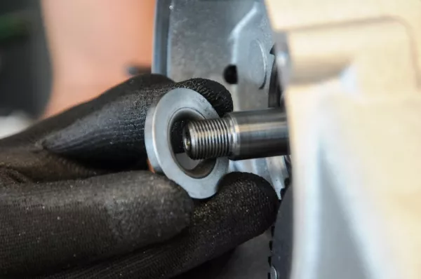 L'exigence concernant le montage d'essai est de passer d'une conception Touring plutôt docile à une conception sportive. Et ce, afin de pouvoir représenter une fois une moyenne des variantes possibles. Comme point de départ pour la série de tests, nous définissons une base avec de faibles angles de braquage, afin de pouvoir tester par la suite le plus grand nombre possible de variantes pertinentes. Pour définir un point de départ, le vilebrequin est monté avec des coussinets et le cylindre est mis en place pour déterminer les angles de braquage.