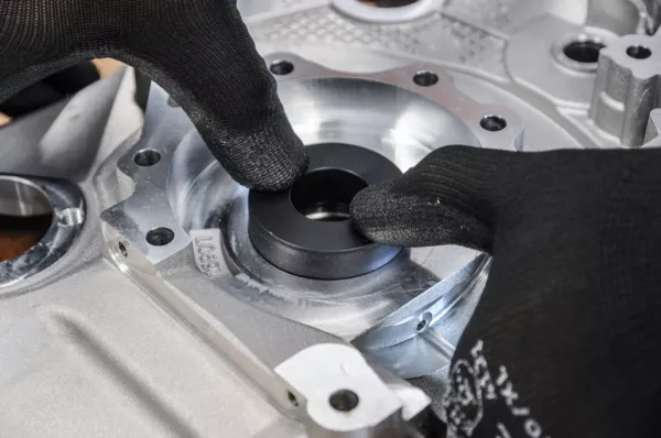 Pour le montage du vilebrequin, la bague d'étanchéité de l'arbre est humidifiée avec un peu d'huile afin que les lèvres d'étanchéité glissent proprement sur le vilebrequin et ne soient pas endommagées.
