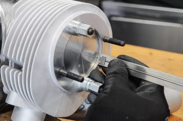 En raison de la compensation de la course plus élevée, le centrage sur la culasse n'est plus nécessaire. C'est pourquoi des trous pour des douilles d'ajustage sont pratiqués dans la culasse et le cylindre. Les douilles d'ajustage évitent que les entretoises utilisées pour la culasse au cours du test ne pénètrent malencontreusement dans la chambre de combustion et n'y causent des dommages involontaires.