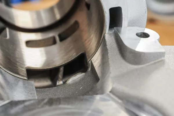NU205. Avant de mettre les roulements en place, nous travaillons le carter moteur et adaptons les cylindres et les canaux de surintensité les uns aux autres. Sur un boîtier moteur Piaggio, cette opération peut prendre des allures de soirée. Le carter Malossi est déjà conçu pour les canaux des cylindres Malossi Sport et MHR et ne nécessite que peu de retouches pour le Quattrini M244. Le plus gros du travail consiste à enlever la surface d'étanchéité à la base du cylindre, qui permet d'utiliser le M244 sur les carters moteur Piaggio.