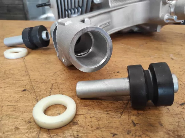 Une autre particularité des carters moteur Malossi est que les silent-gums d'origine livrés avec le moteur sont trop étroits pour le carter moteur. Mieux encore, Malossi a simplement orienté les sièges pour les silent-gums plus bas dans le carter que ce n'est le cas à l'origine. Ainsi, le carter moteur peut se déplacer sur les silent-gums en direction du cadre. Il y a quelque temps déjà, nous avons essayé de résoudre ce problème à l'aide d'un kit de réparation.