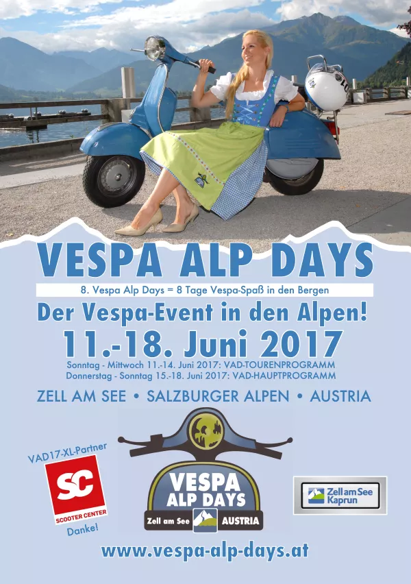 Wie sind Deine Urlaubpläne für 2017? Celle und Zell: In unserem Veranstaltungskalender findest Du im Juni von 11. bis 25. Juni 2 Wochen mit geballter Vespa-Action: Die Vespa Alp Days veranstaltet das Team um Franz Schmalz aus Zell am See seit 2010. Der Start war ein Jahr nach den Vespa World Days 2009 in Zell am See. Wir waren in Zell am See am Start und sind begeistert von der Atmosphäre und der Kulisse. Die Touren in die Berge sind ein tolles Erlebnis. 8. Vespa Alp Days 2017 11-06-2017 - 18-06-2017 8. VESPA ALP DAYS 2017 Zell Am See [su_spacer size="20"]