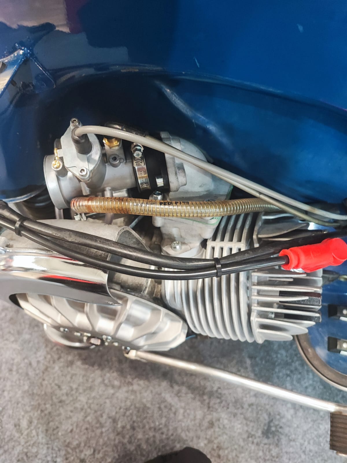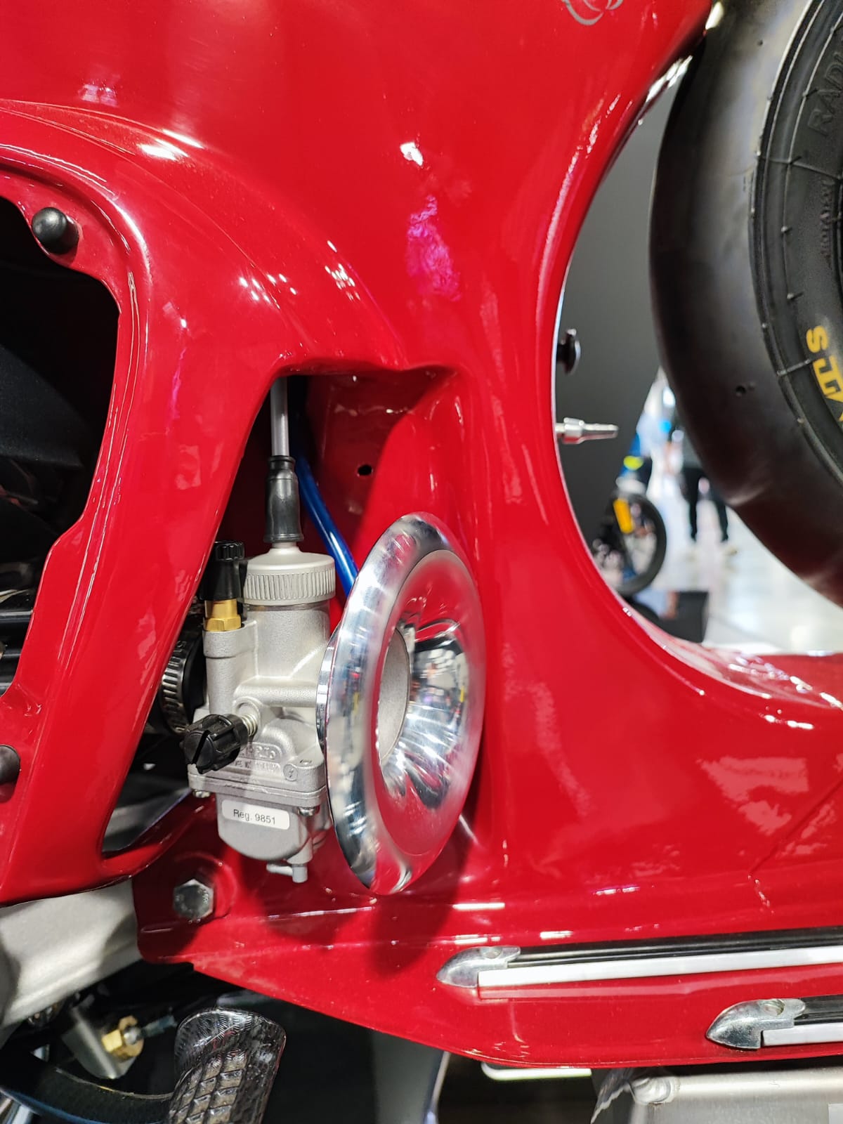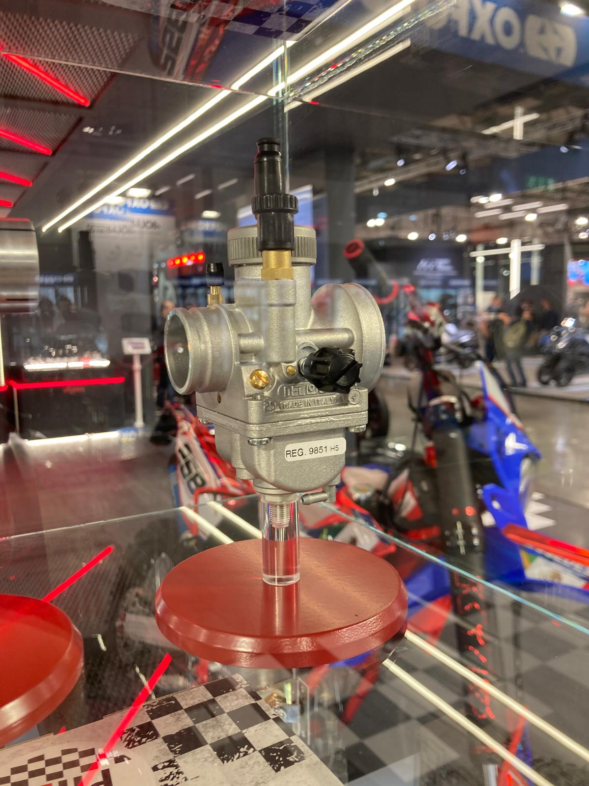 Dell’Orto hat zur erneuten Präsentation ihres PHDG-Vergasertyps eine wunderschöne Vespa SS90 von Fabbri Racing gezeigt, auf der publikumswirksam ein PHDG-24-mm-Vergaser auf dem Fabbri-180-Kit mit Vergaserposition nach vorne – aus der Seitenhaube heraus – montiert war. Inwiefern der Vergaser tatsächlich ein derart leistungsstarkes Zylinderkit ausreichend befüllen kann, lassen wir offen, aber der große Ansaugtrichter machte auf jeden Fall Eindruck.