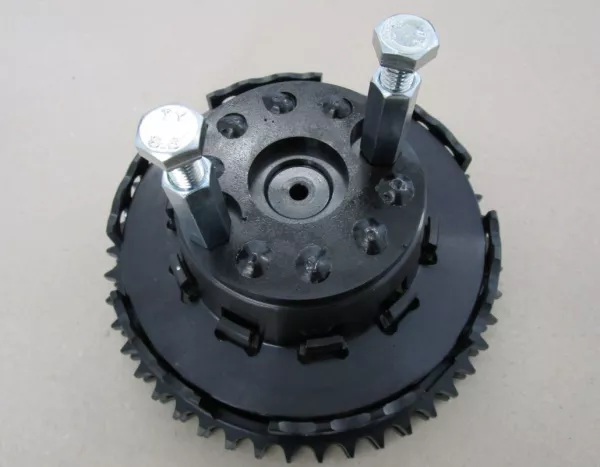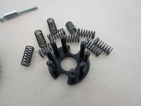 BGM Superstrong for Lambretta already has a "built-in" clutch compressor system. The clutch comes with two bolts and long nuts for this purpose. Two of the legs are marked with a dot on the front of the clutch spider, at the bottom of which the threaded hole for the bolt is located.
