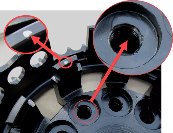 The screws for pretensioning the base plate are threaded in here. The cut-out in the centering aid provides space for the high nuts, which are used to pretension the clutch for assembly.