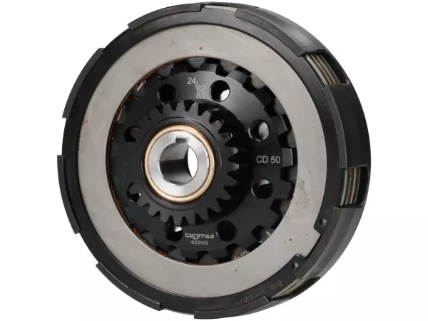 The scope of delivery includes the complete ready-to-install clutch with bgm PRO Cosa clutch facings and ten BGM PRO XL springs. A new O-ring for the clutch cover, the half-moon wedge and a new clutch nut are also included. We use a nut with clamping part (MBN13023, T2, strength class 10, DBL9440.40) as we have had the best experience with this nut in racing with over 40 hp shaft power. Tightening torque 70-75NM. We do not recommend other locking devices such as Nordlock, corrugated spring washers (DIN137) or serrated lock washers (DIN6798).