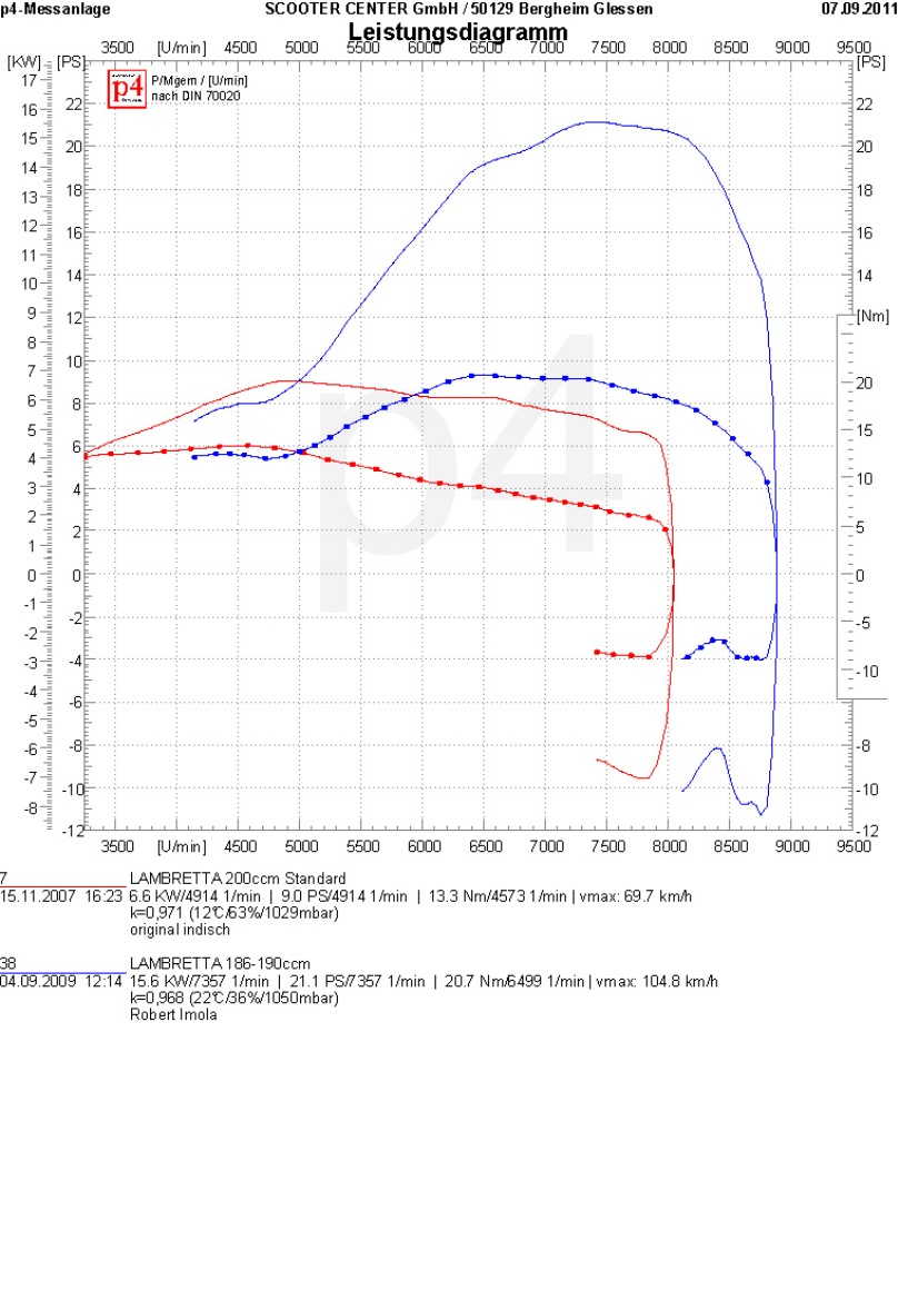 On the diagram you can see a nice tape of the Imola engine with 60 mm bgm crankshaft, 30 mm bgm PWK carburetor and the Jl3 exhaust. The reference run (red) is an Indian Stage4 engine (Sh22, Indian Big Bore exhaust).