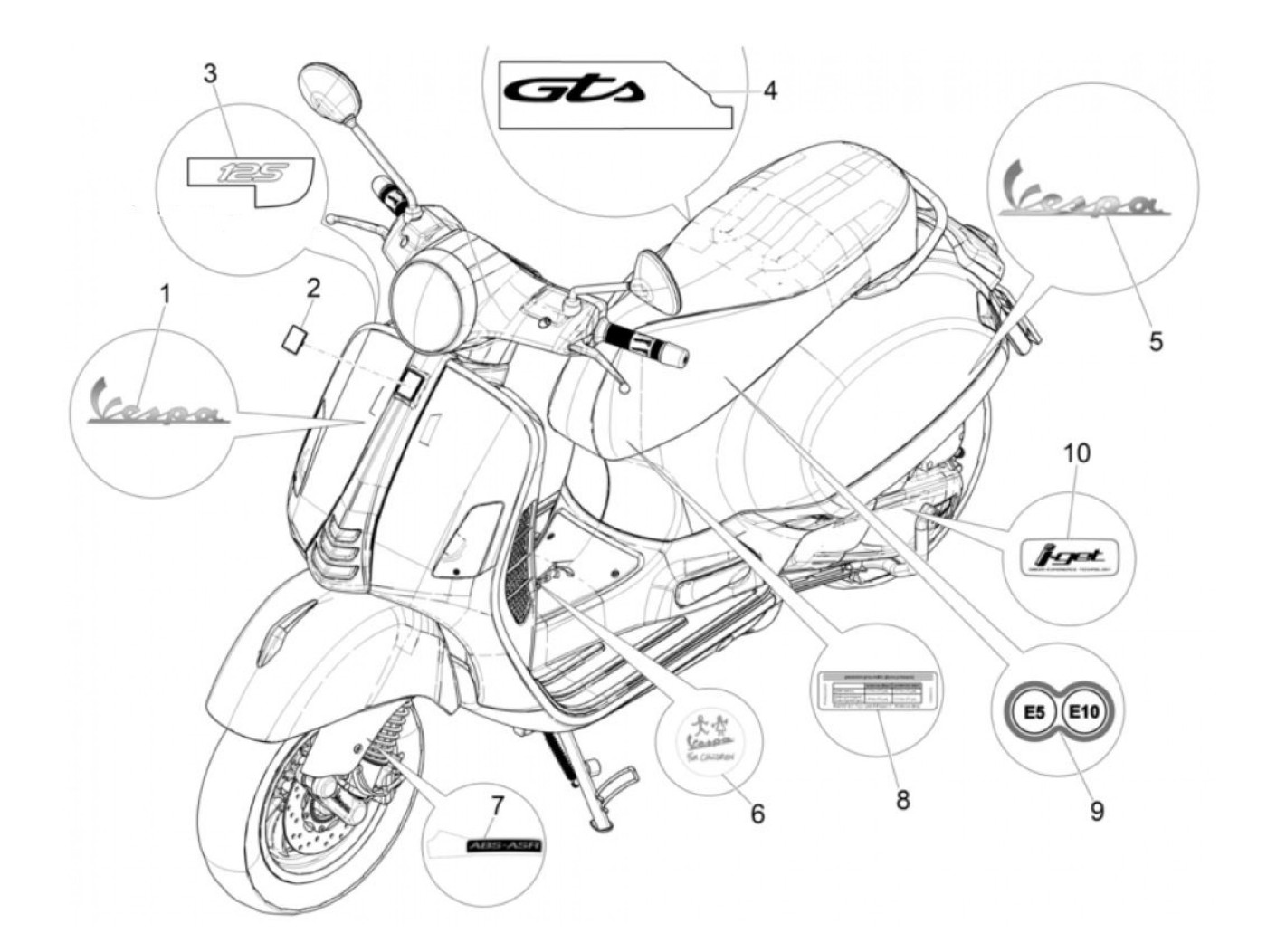Badge -PIAGGIO- (E5)/(E10) - Vespa GTS 125 (ZAPMA3700), Vespa GTS HPE 300 (ZAPMA3600), Vespa GTS Super 125 (ZAPMA3700), Vespa GTS Super HPE 300 (ZAPMA360, ZAPMD3100, ZAPMD3101, ZAPMD3102), Vespa Primavera 125 (ZAPMA1100, ZAPMA1101, ZAPMD1100), Vespa Spr