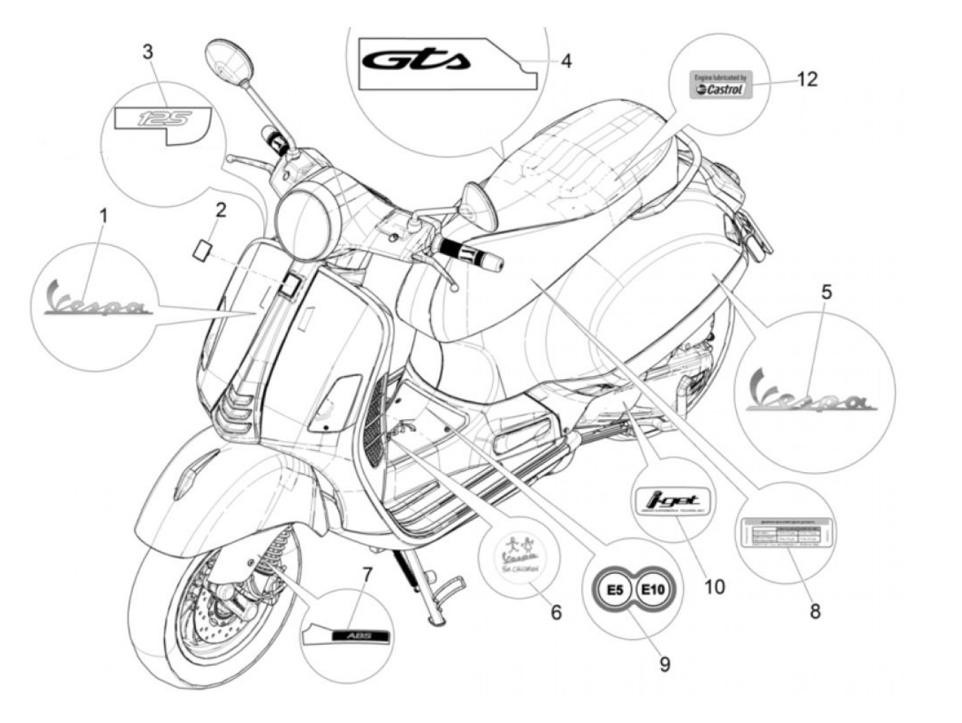 Badge -PIAGGIO- Vespa for children - Vespa GTS 125 (ZAPMA3100, ZAPMA3200, ZAPMA3700), Vespa GTS 150 (ZAPMA3200, ZAPMA3100), Vespa GTS 250 (ZAPM45100), Vespa GTS 300 (ZAPM45200, ZAPM45202, ZAPMA3300), Vespa GTS HPE 300 (ZAPMA3600), Vespa GTS Super 125 (Z
