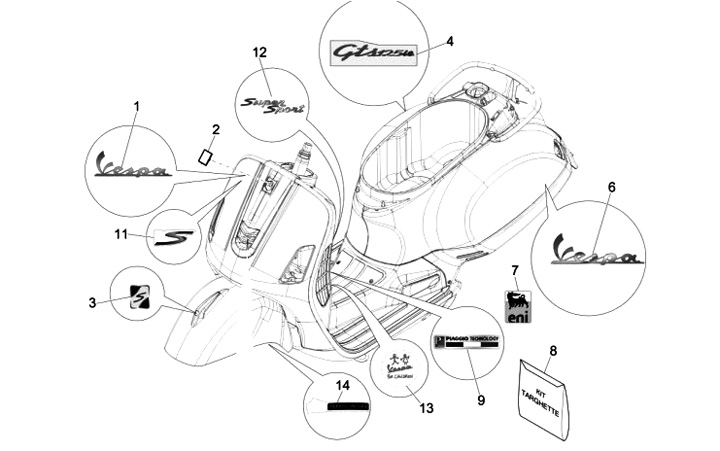 Badge -PIAGGIO- Vespa for children - Vespa GTS 125 (ZAPMA3100, ZAPMA3200, ZAPMA3700), Vespa GTS 150 (ZAPMA3200, ZAPMA3100), Vespa GTS 250 (ZAPM45100), Vespa GTS 300 (ZAPM45200, ZAPM45202, ZAPMA3300), Vespa GTS HPE 300 (ZAPMA3600), Vespa GTS Super 125 (Z