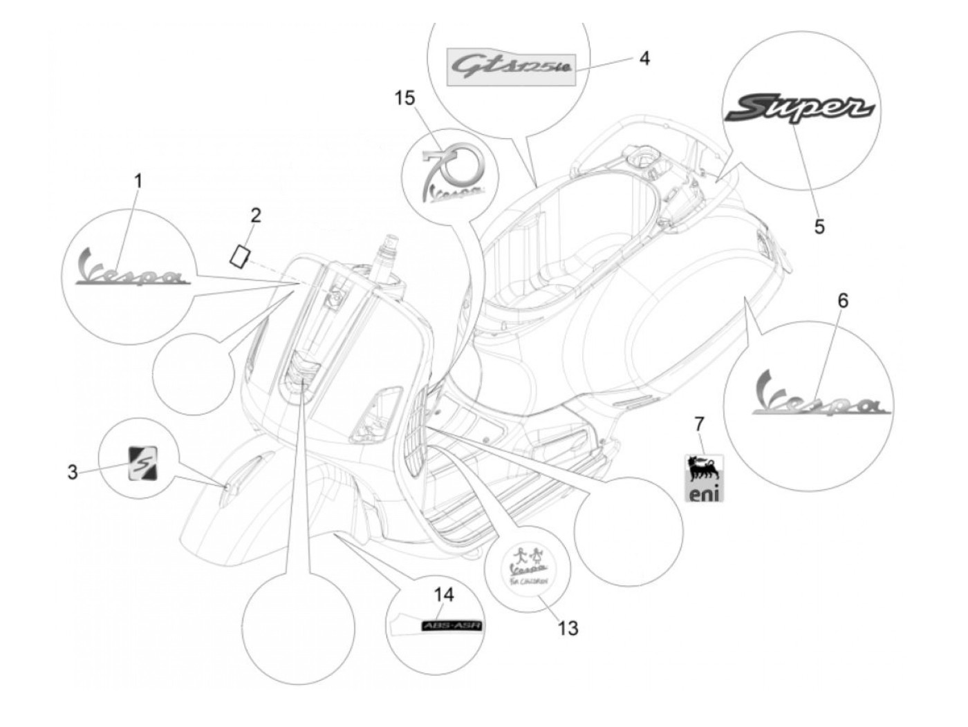 Badge -PIAGGIO- Vespa for children - Vespa GTS 125 (ZAPMA3100, ZAPMA3200, ZAPMA3700), Vespa GTS 150 (ZAPMA3200, ZAPMA3100), Vespa GTS 250 (ZAPM45100), Vespa GTS 300 (ZAPM45200, ZAPM45202, ZAPMA3300), Vespa GTS HPE 300 (ZAPMA3600), Vespa GTS Super 125 (Z