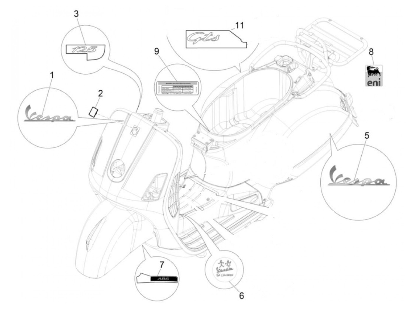 Badge -PIAGGIO- Vespa for children - Vespa GTS 125 (ZAPMA3100, ZAPMA3200, ZAPMA3700), Vespa GTS 150 (ZAPMA3200, ZAPMA3100), Vespa GTS 250 (ZAPM45100), Vespa GTS 300 (ZAPM45200, ZAPM45202, ZAPMA3300), Vespa GTS HPE 300 (ZAPMA3600), Vespa GTS Super 125 (Z