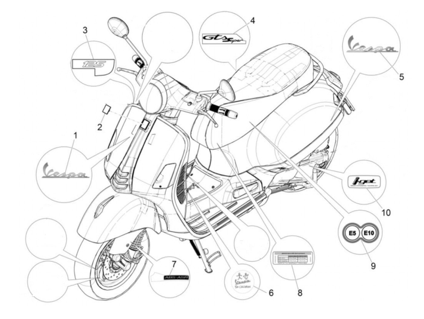 Badge -PIAGGIO- (E5)/(E10) - Vespa GTS 125 (ZAPMA3700), Vespa GTS HPE 300 (ZAPMA3600), Vespa GTS Super 125 (ZAPMA3700), Vespa GTS Super HPE 300 (ZAPMA360, ZAPMD3100, ZAPMD3101, ZAPMD3102), Vespa Primavera 125 (ZAPMA1100, ZAPMA1101, ZAPMD1100), Vespa Spr