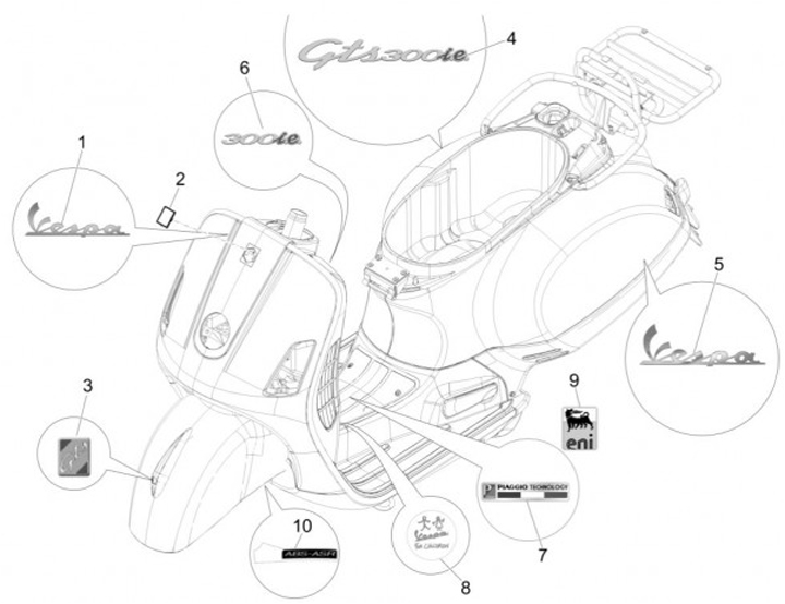 Badge -PIAGGIO- Vespa for children - Vespa GTS 125 (ZAPMA3100, ZAPMA3200, ZAPMA3700), Vespa GTS 150 (ZAPMA3200, ZAPMA3100), Vespa GTS 250 (ZAPM45100), Vespa GTS 300 (ZAPM45200, ZAPM45202, ZAPMA3300), Vespa GTS HPE 300 (ZAPMA3600), Vespa GTS Super 125 (Z