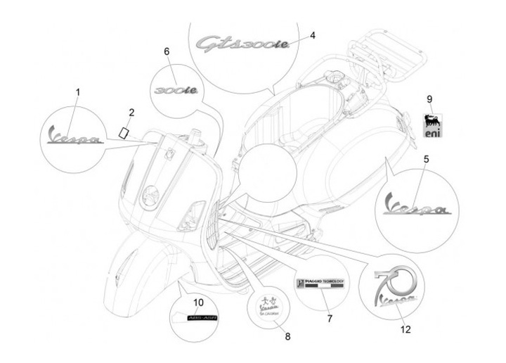 Badge -PIAGGIO- Vespa for children - Vespa GTS 125 (ZAPMA3100, ZAPMA3200, ZAPMA3700), Vespa GTS 150 (ZAPMA3200, ZAPMA3100), Vespa GTS 250 (ZAPM45100), Vespa GTS 300 (ZAPM45200, ZAPM45202, ZAPMA3300), Vespa GTS HPE 300 (ZAPMA3600), Vespa GTS Super 125 (Z