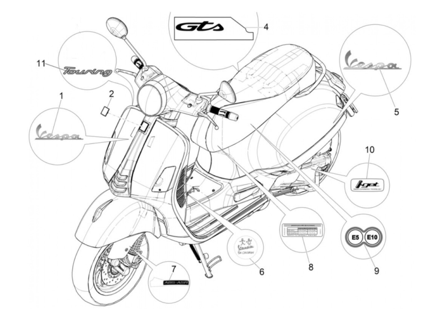 Badge -PIAGGIO- Vespa for children - Vespa GTS 125 (ZAPMA3100, ZAPMA3200, ZAPMA3700), Vespa GTS 150 (ZAPMA3200, ZAPMA3100), Vespa GTS 250 (ZAPM45100), Vespa GTS 300 (ZAPM45200, ZAPM45202, ZAPMA3300), Vespa GTS HPE 300 (ZAPMA3600), Vespa GTS Super 125 (Z