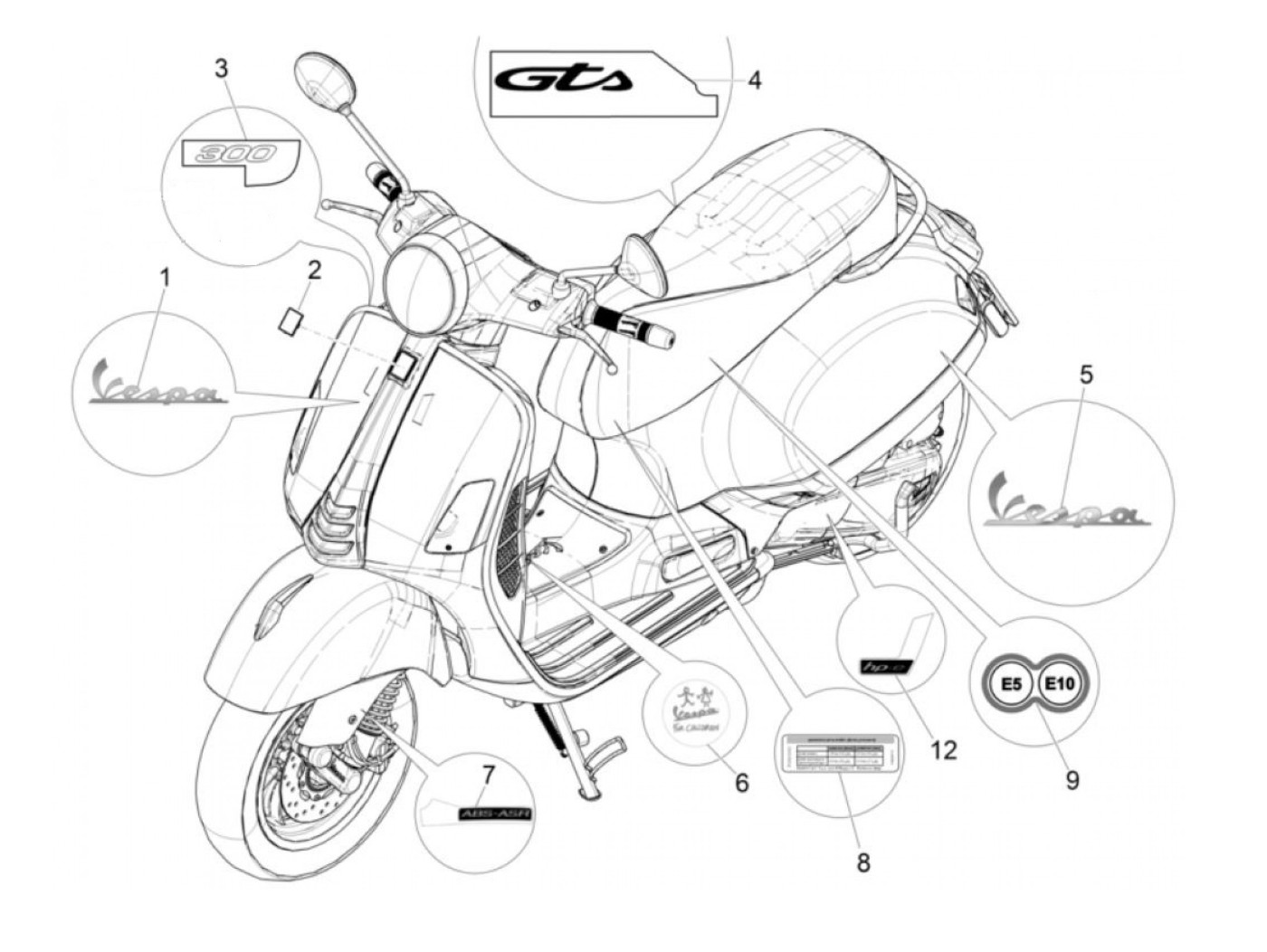 Badge -PIAGGIO- (E5)/(E10) - Vespa GTS 125 (ZAPMA3700), Vespa GTS HPE 300 (ZAPMA3600), Vespa GTS Super 125 (ZAPMA3700), Vespa GTS Super HPE 300 (ZAPMA360, ZAPMD3100, ZAPMD3101, ZAPMD3102), Vespa Primavera 125 (ZAPMA1100, ZAPMA1101, ZAPMD1100), Vespa Spr