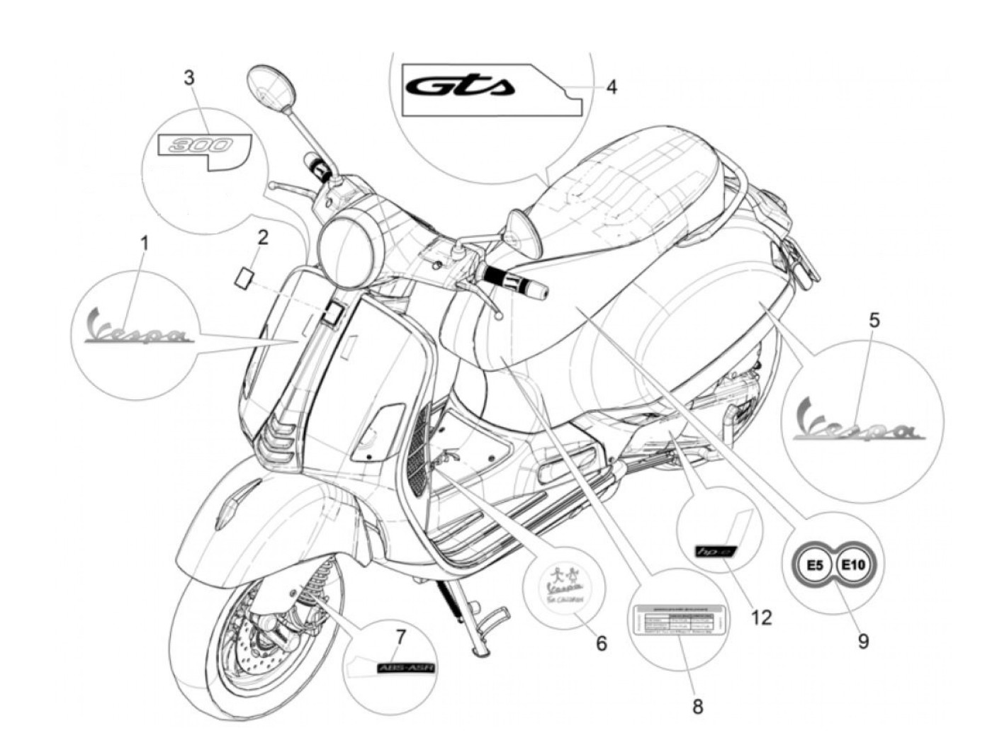 Badge -PIAGGIO- (E5)/(E10) - Vespa GTS 125 (ZAPMA3700), Vespa GTS HPE 300 (ZAPMA3600), Vespa GTS Super 125 (ZAPMA3700), Vespa GTS Super HPE 300 (ZAPMA360, ZAPMD3100, ZAPMD3101, ZAPMD3102), Vespa Primavera 125 (ZAPMA1100, ZAPMA1101, ZAPMD1100), Vespa Spr