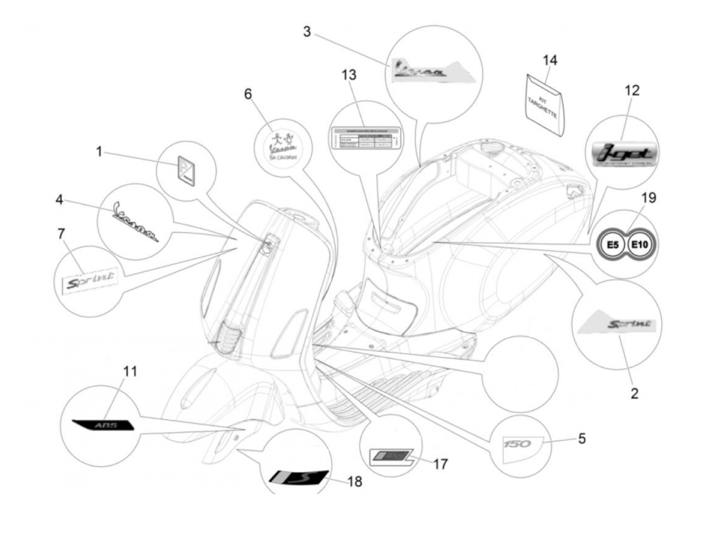 Badge -PIAGGIO- (E5)/(E10) - Vespa GTS 125 (ZAPMA3700), Vespa GTS HPE 300 (ZAPMA3600), Vespa GTS Super 125 (ZAPMA3700), Vespa GTS Super HPE 300 (ZAPMA360, ZAPMD3100, ZAPMD3101, ZAPMD3102), Vespa Primavera 125 (ZAPMA1100, ZAPMA1101, ZAPMD1100), Vespa Spr