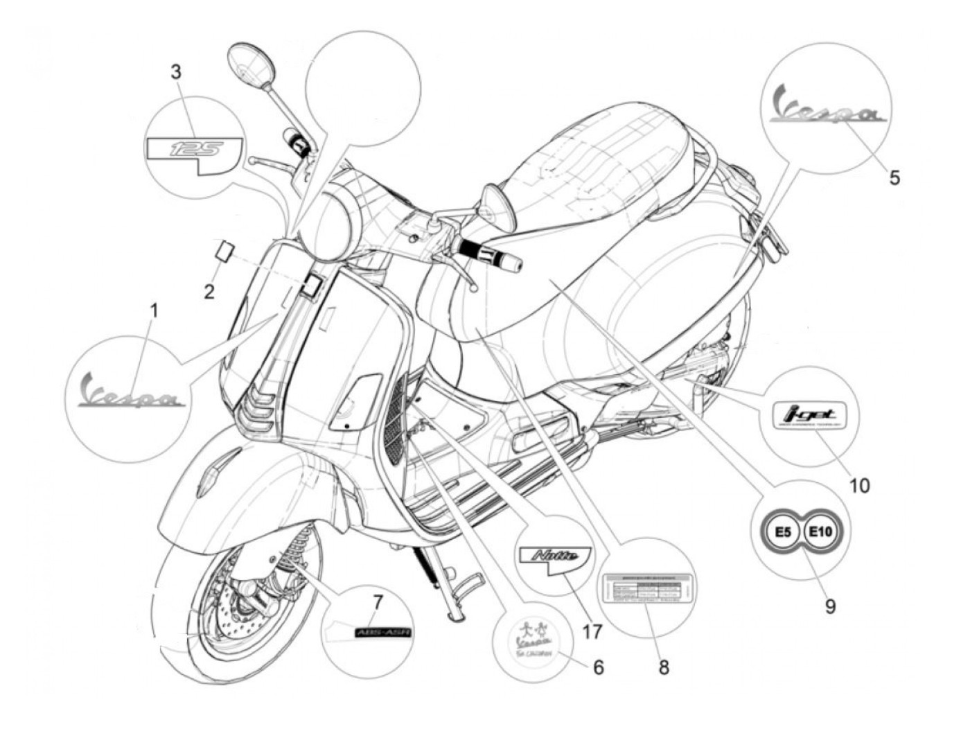 Badge -PIAGGIO- (E5)/(E10) - Vespa GTS 125 (ZAPMA3700), Vespa GTS HPE 300 (ZAPMA3600), Vespa GTS Super 125 (ZAPMA3700), Vespa GTS Super HPE 300 (ZAPMA360, ZAPMD3100, ZAPMD3101, ZAPMD3102), Vespa Primavera 125 (ZAPMA1100, ZAPMA1101, ZAPMD1100), Vespa Spr