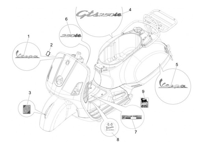 Badge -PIAGGIO- Vespa for children - Vespa GTS 125 (ZAPMA3100, ZAPMA3200, ZAPMA3700), Vespa GTS 150 (ZAPMA3200, ZAPMA3100), Vespa GTS 250 (ZAPM45100), Vespa GTS 300 (ZAPM45200, ZAPM45202, ZAPMA3300), Vespa GTS HPE 300 (ZAPMA3600), Vespa GTS Super 125 (Z