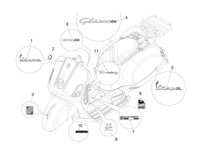 Badge -PIAGGIO- Vespa for children - Vespa GTS 125 (ZAPMA3100, ZAPMA3200, ZAPMA3700), Vespa GTS 150 (ZAPMA3200, ZAPMA3100), Vespa GTS 250 (ZAPM45100), Vespa GTS 300 (ZAPM45200, ZAPM45202, ZAPMA3300), Vespa GTS HPE 300 (ZAPMA3600), Vespa GTS Super 125 (Z