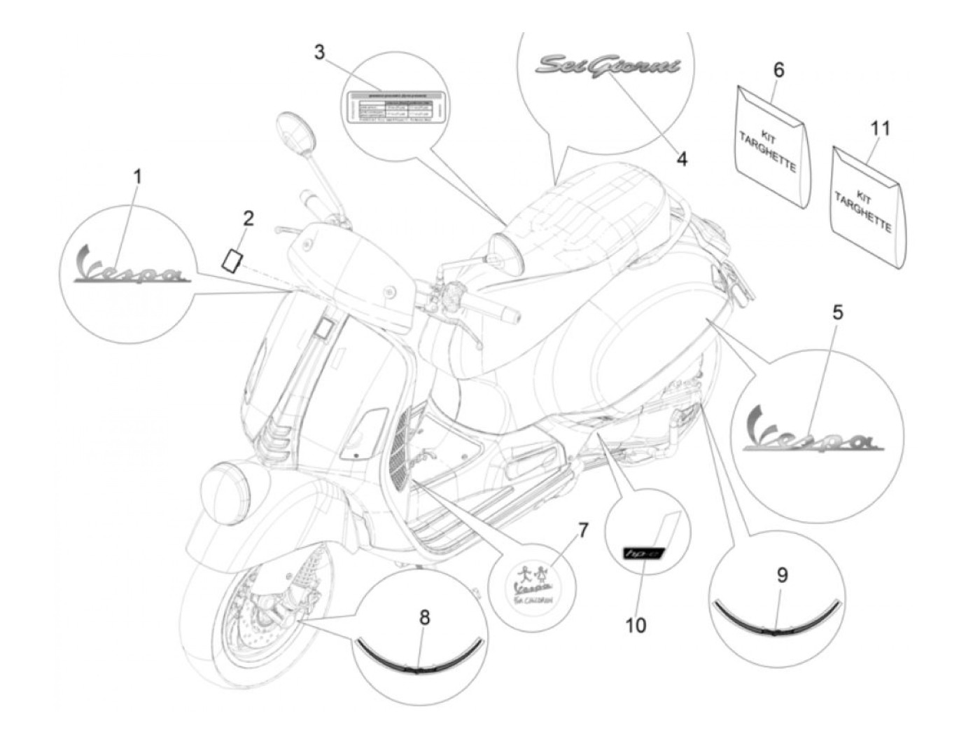 Badge -PIAGGIO- Vespa for children - Vespa GTS 125 (ZAPMA3100, ZAPMA3200, ZAPMA3700), Vespa GTS 150 (ZAPMA3200, ZAPMA3100), Vespa GTS 250 (ZAPM45100), Vespa GTS 300 (ZAPM45200, ZAPM45202, ZAPMA3300), Vespa GTS HPE 300 (ZAPMA3600), Vespa GTS Super 125 (Z