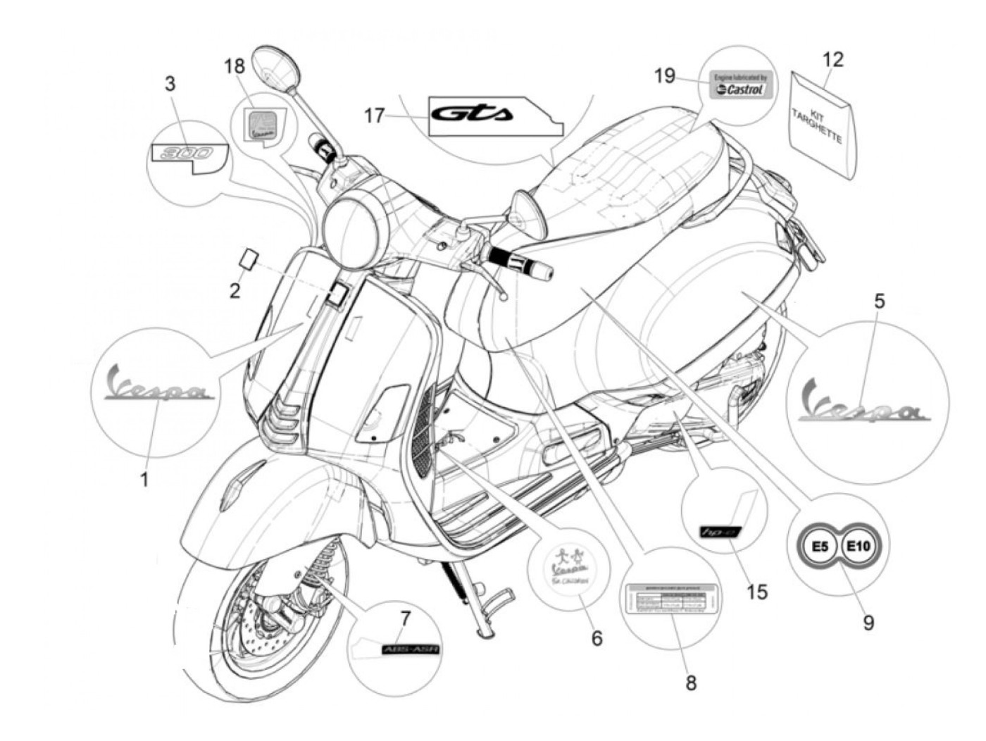 Badge -PIAGGIO- ABS ASR - Vespa GTS 125 (ZAPMA3700), Vespa GTS 300 (ZAPM45200, ZAPM45202, ZAPMA3300), Vespa GTS HPE 300 (ZAPMA3600), Vespa GTS Super 125 (ZAPM45300, ZAPMA3700, ZAPM45301), Vespa GTS Super 300 (ZAPM45200, ZAPM45202, ZAPMA3300), Vespa GTS