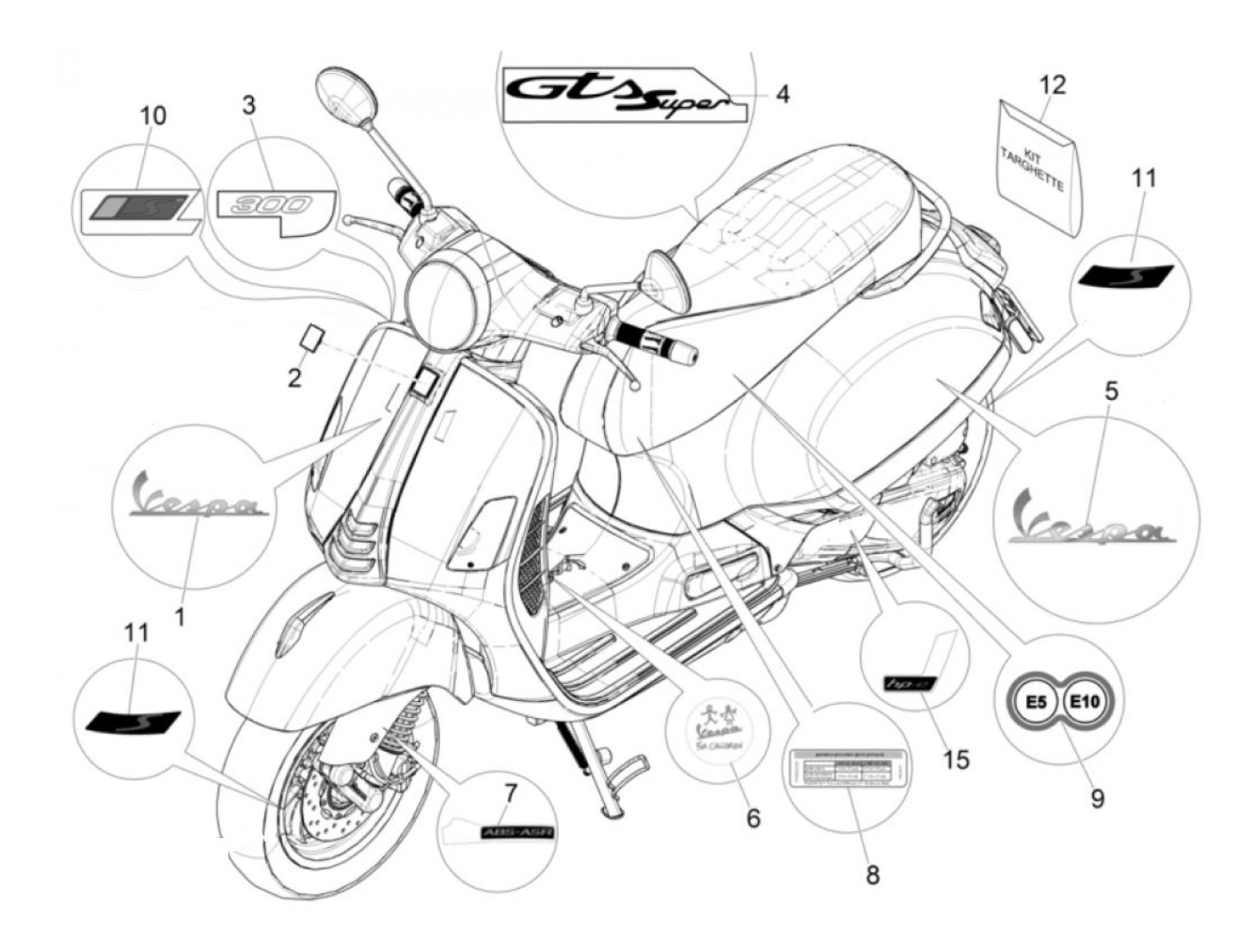 Badge -PIAGGIO- (E5)/(E10) - Vespa GTS 125 (ZAPMA3700), Vespa GTS HPE 300 (ZAPMA3600), Vespa GTS Super 125 (ZAPMA3700), Vespa GTS Super HPE 300 (ZAPMA360, ZAPMD3100, ZAPMD3101, ZAPMD3102), Vespa Primavera 125 (ZAPMA1100, ZAPMA1101, ZAPMD1100), Vespa Spr