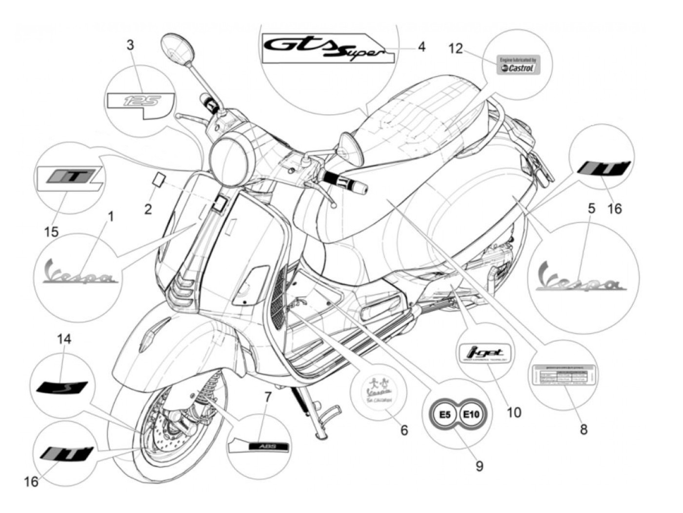 Badge -PIAGGIO- Castrol - Vespa GTS 125 (ZAPMD3200), Vespa GTS Super 125 (ZAPMD3200), Piaggio Beverly HPE 300 (ZAPMD2100)