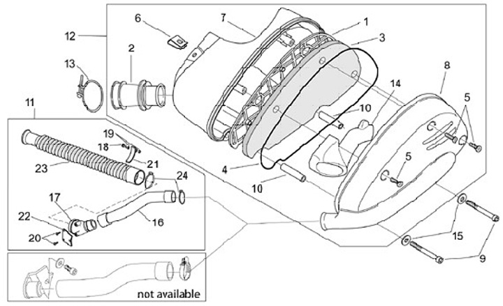 Air filter box -PIAGGIO- Aprilia SR50 (Suzuki Motor, ZD4RLA), SR50 (Piaggio engine, ZD4TEA, ZD4VFD00), SR50 DiTech (Suzuki engine, ZD4RLB, ZD4RLE), SR50 DiTech (Piaggio engine, ZD4RLD, ZD4TE0)
