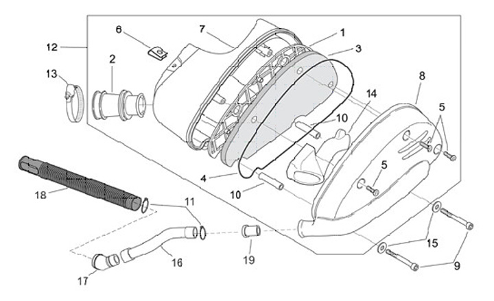 Air filter box -PIAGGIO- Aprilia SR50 (Suzuki Motor, ZD4RLA), SR50 (Piaggio engine, ZD4TEA, ZD4VFD00), SR50 DiTech (Suzuki engine, ZD4RLB, ZD4RLE), SR50 DiTech (Piaggio engine, ZD4RLD, ZD4TE0)