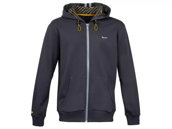 Hood lining with pattern print and elastic drawstring with snap closure. Made of 100% cotton, brushed inside, for all seasons. Reflective Vespa® logo on the chest. Reflective stripes with Vespa® logo on the outside of the hood, zipper with reflectors, metal zipper with Tricolore detail, right sleeve with Vespa Shape print, left sleeve with Tricolore embroidery.AI-translation