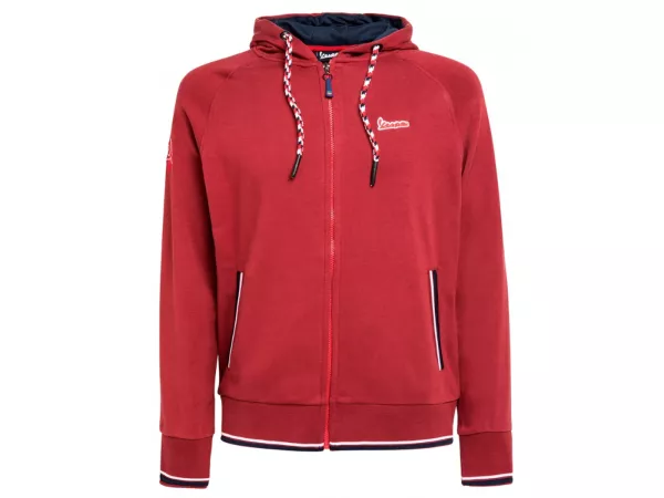 Sweatshirt jacket made of 100% cotton, roughened inside, for all seasons. Vespa patch on the front, contrast offered by the colored Tricolor zipper in silicone. Right arm embroidered with Vespa Primavera profile. The cuffs at the wrists and waist are made of elastic material. With two pockets on the front. Tricolor reflective patch on the hood.AI-translation