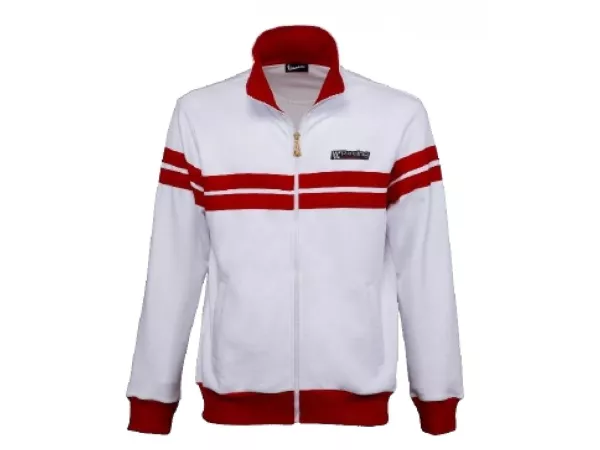 Jacket made of 100% cotton. Racing Sixties patch on the front with bold double stripes, a clear allusion to the racing of the 60s. Contrasting colours on the inside collar and wrists, elasticated cuffs. Gold-coloured metal zipper. With two pockets on the front and Vespa logo® on the back.AI-translation