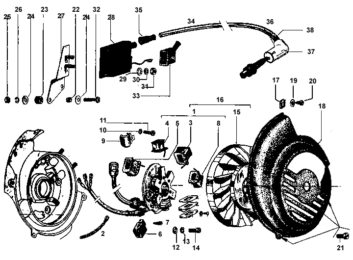 Ignition -PIAGGIO stator- Vespa PK XL, Ape 50 - 5 coils, 6-cable (round plug with 3-pin) - for vehicles without battery