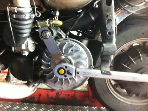 The Buzzwangle tool is an ingenious idea from Sticky. A digital degree disk can be clamped onto the threads for the pole wheel puller using an adapter with four mounts. This means that the digital dial indicator is fixed in place and both the ignition timing and the timing can be determined and set to an accuracy of 0.1°.