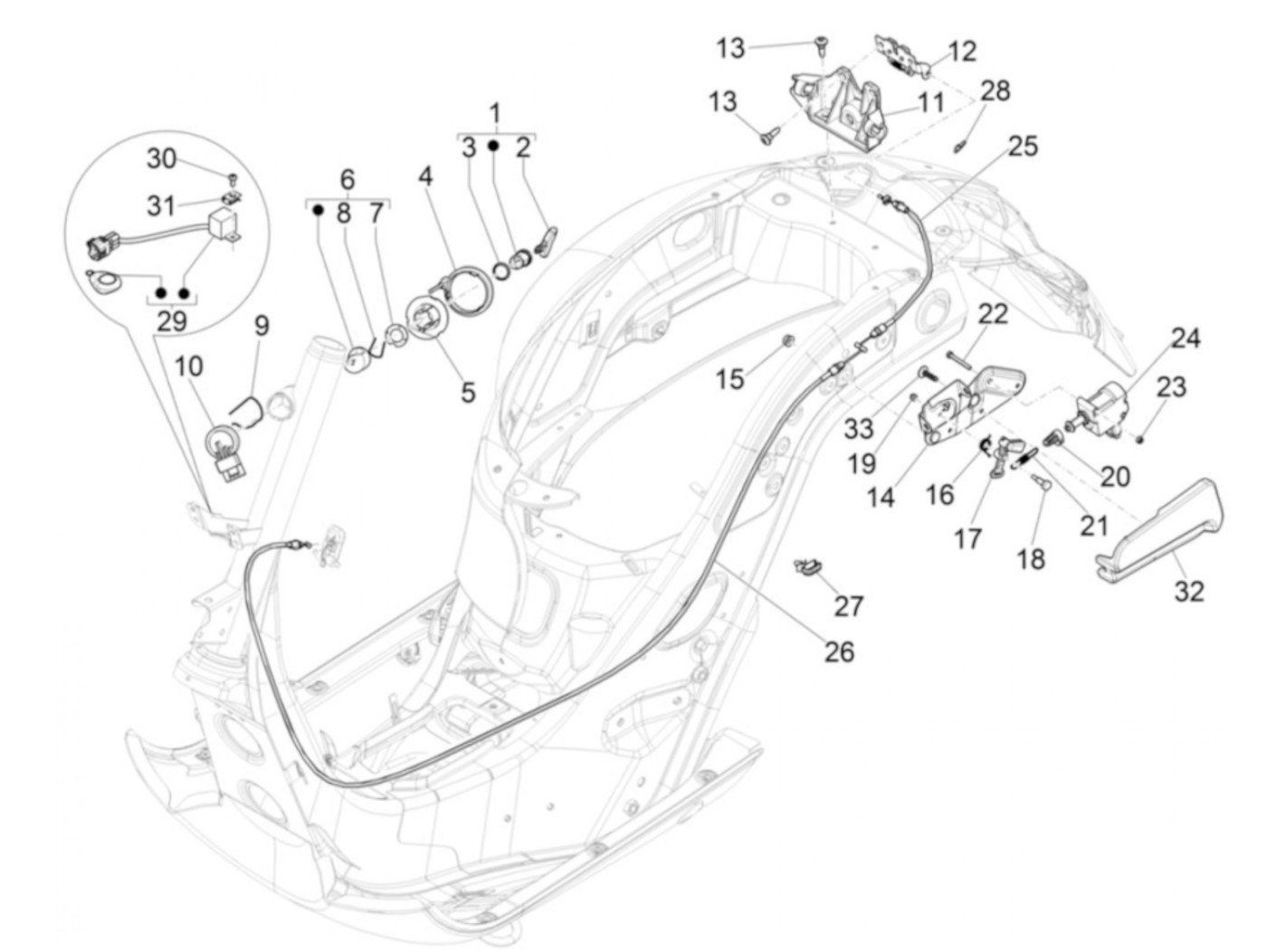 Joint for seat release (electric) -PIAGGIO- Vespa GT 250 (ZAPM45102), Vespa GT L 125 (ZAPM31100, ZAPM31101), Vespa GT L 200 (ZAPM31200), Vespa GTS 125 (ZAPM31300, ZAPMA3100, ZAPMA3200, ZAPMA3700), Vespa GTS 150 (ZAPMA3200, ZAPMA3100), Vespa GTS 250 (ZAPM4