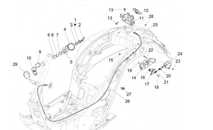 Seat lock -PIAGGIO- Vespa GT 250 (ZAPM45102), Vespa GT L 125 (ZAPM31100, ZAPM31101), Vespa GT L 200 (ZAPM31200), Vespa GTS 125 (ZAPM31300, ZAPMA3100, ZAPMA3200, ZAPMA3700), Vespa GTS 150 (ZAPMA3200, ZAPMA3100), Vespa GTS 250 (ZAPM45100, ZAPM45101), Vespa