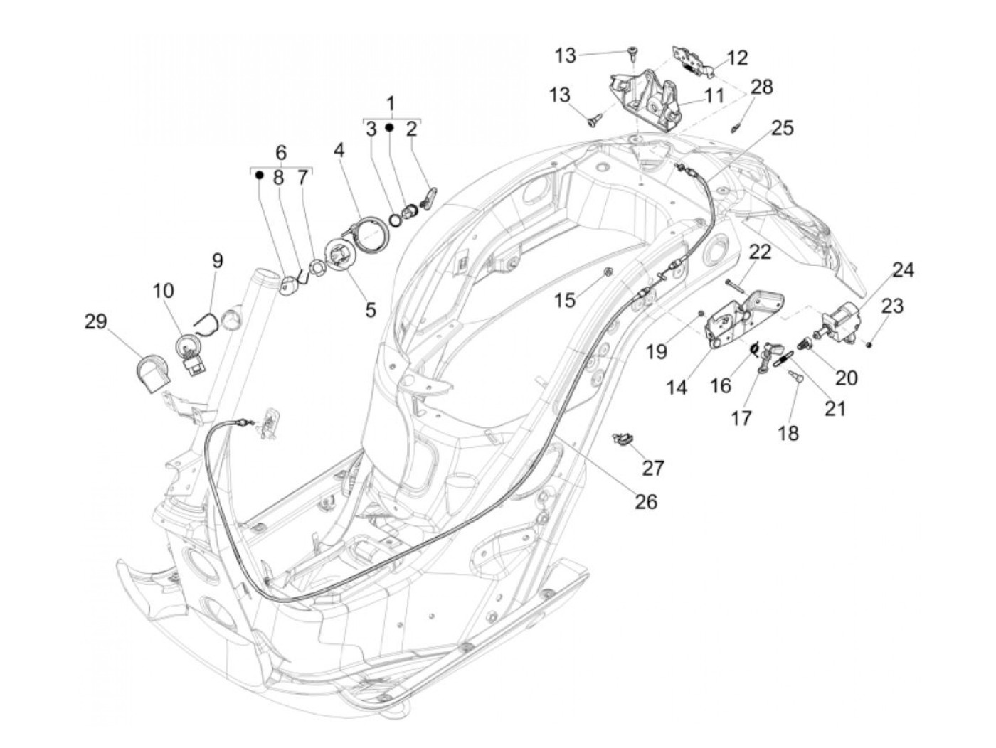 Seat lock -PIAGGIO- Vespa GT 250 (ZAPM45102), Vespa GT L 125 (ZAPM31100, ZAPM31101), Vespa GT L 200 (ZAPM31200), Vespa GTS 125 (ZAPM31300, ZAPMA3100, ZAPMA3200, ZAPMA3700), Vespa GTS 150 (ZAPMA3200, ZAPMA3100), Vespa GTS 250 (ZAPM45100, ZAPM45101), Vespa