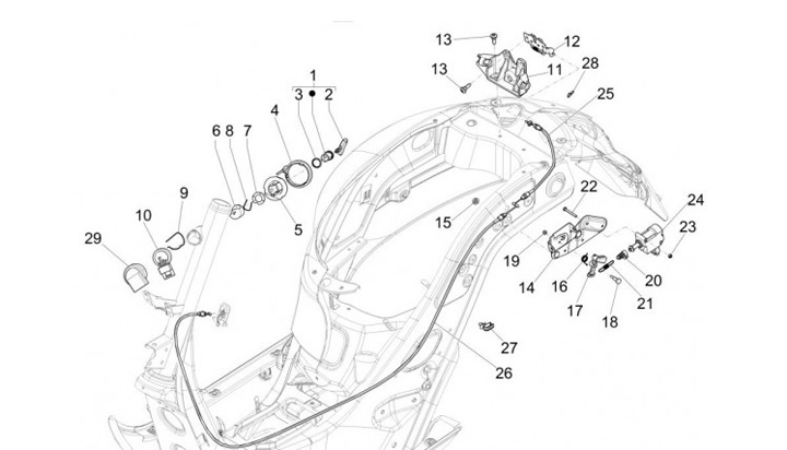 On-Off lock body -PIAGGIO- Vespa GT 250 (ZAPM45102), Vespa GT L 125 (ZAPM31100, ZAPM31101), Vespa GT L 200 (ZAPM31200), Vespa GTS 125 (ZAPM31300), Vespa GTS 250 (ZAPM45100, ZAPM45101), Vespa GTS 300 (ZAPM45200, ZAPM45202), Vespa GTS Super 125 (ZAPM45300,
