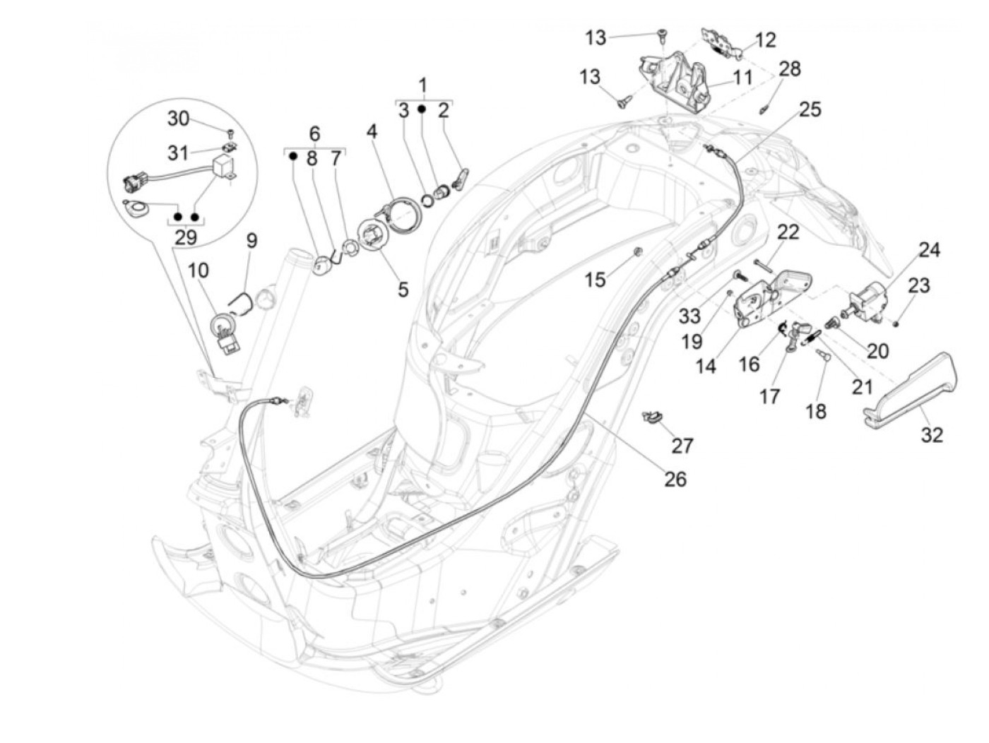 Seat lock -PIAGGIO- Vespa GT 250 (ZAPM45102), Vespa GT L 125 (ZAPM31100, ZAPM31101), Vespa GT L 200 (ZAPM31200), Vespa GTS 125 (ZAPM31300, ZAPMA3100, ZAPMA3200, ZAPMA3700), Vespa GTS 150 (ZAPMA3200, ZAPMA3100), Vespa GTS 250 (ZAPM45100, ZAPM45101), Vespa