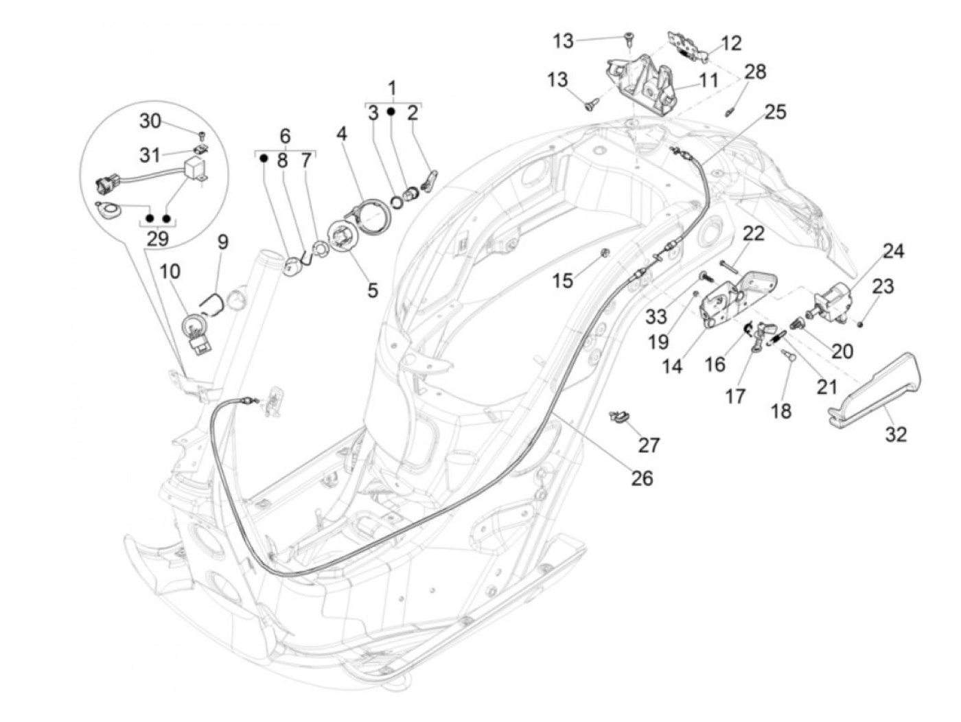 Seat lock -PIAGGIO- Vespa GT 250 (ZAPM45102), Vespa GT L 125 (ZAPM31100, ZAPM31101), Vespa GT L 200 (ZAPM31200), Vespa GTS 125 (ZAPM31300, ZAPMA3100, ZAPMA3200, ZAPMA3700), Vespa GTS 150 (ZAPMA3200, ZAPMA3100), Vespa GTS 250 (ZAPM45100, ZAPM45101), Vespa