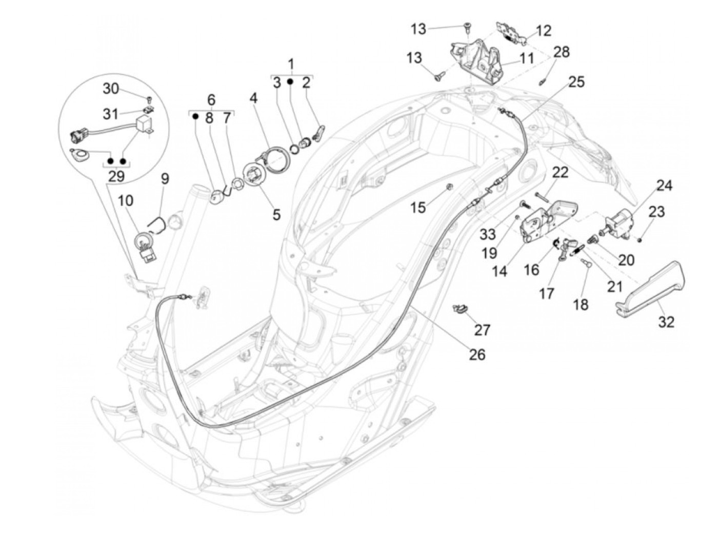 Seat lock -PIAGGIO- Vespa GT 250 (ZAPM45102), Vespa GT L 125 (ZAPM31100, ZAPM31101), Vespa GT L 200 (ZAPM31200), Vespa GTS 125 (ZAPM31300, ZAPMA3100, ZAPMA3200, ZAPMA3700), Vespa GTS 150 (ZAPMA3200, ZAPMA3100), Vespa GTS 250 (ZAPM45100, ZAPM45101), Vespa